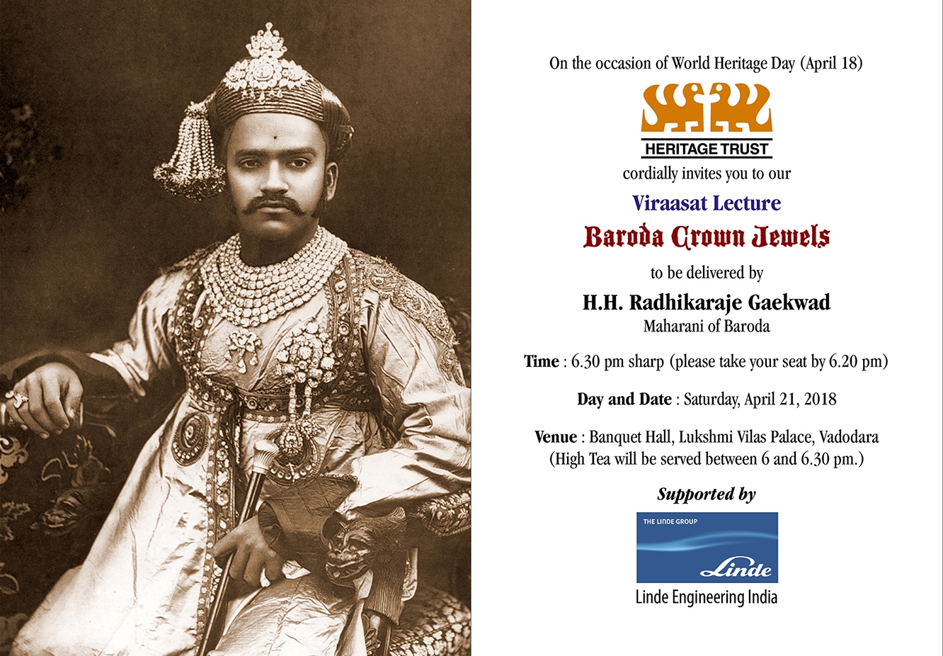 Venue : Banquet Hall, Lukshmi Vilas Palace, Vadodara (High Tea will be served between 6 and 6.30 pm.)